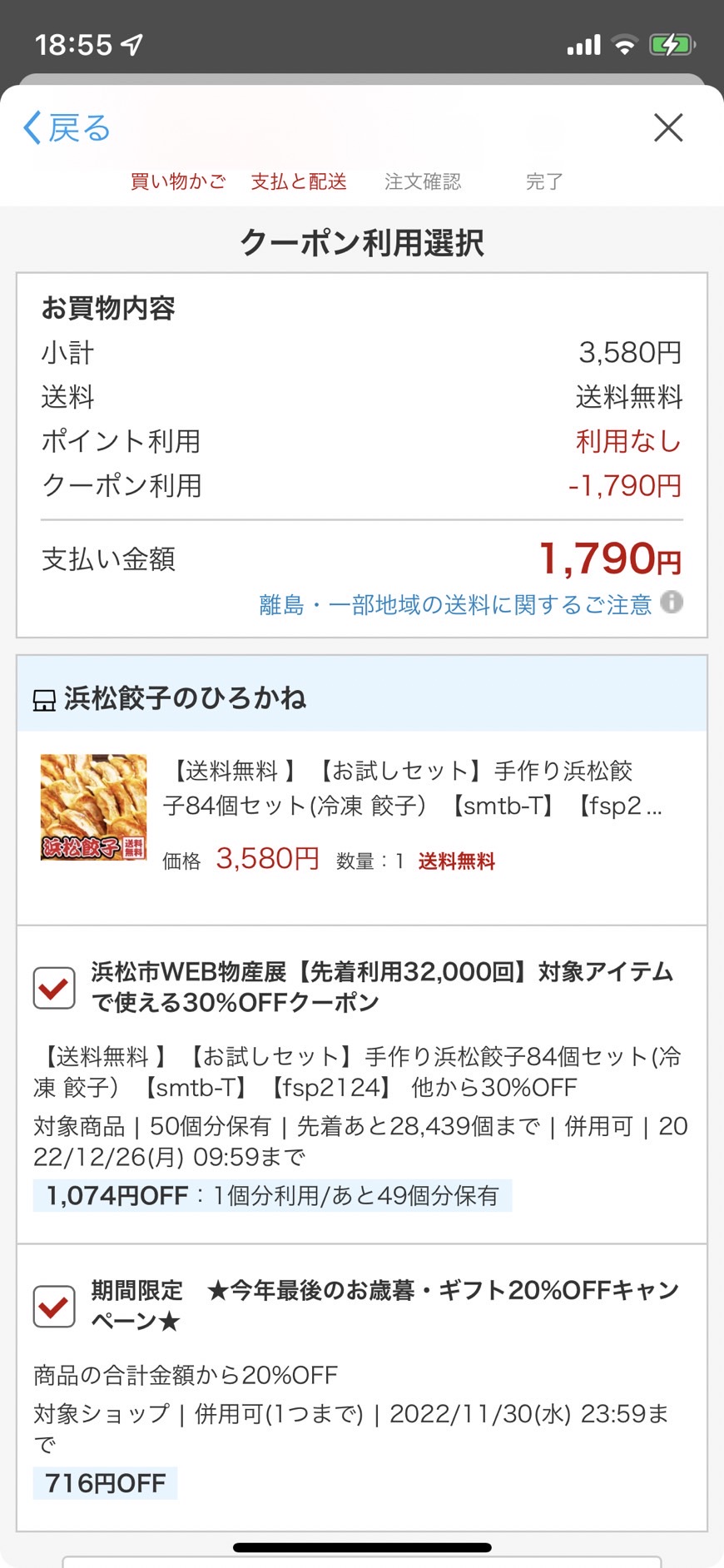 今日は、餃子に30%オフと20%オフのクーポンが併用できるってことで
