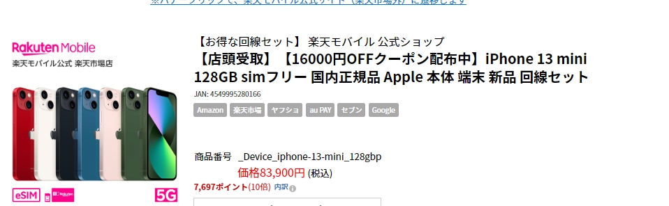 iphone13 miniが83900円からクーポンで16000円引きに。
